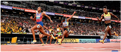 女子100米决赛,杰斐逊-伍登以逆风10秒61的成绩创造了世锦赛纪录,以0.15秒的优势击败牙买加选手克莱顿,领先奥运会冠军朱利安•阿尔弗雷德0.23秒,这是世锦赛历史上的第二大胜差。她也成为历史上第四快的女子短跑选手。